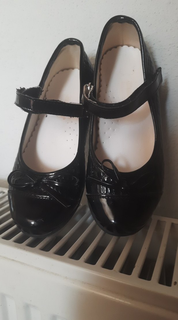 Kız çocuklar için siyah rugan görünümlü, tokalı bantlı babetler. Düz tasarım ve küçük fiyonk detayı içerir.
