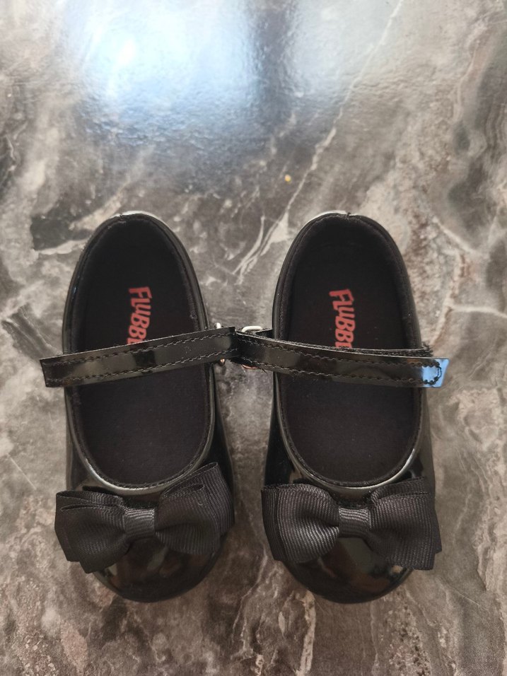 Siyah rugan malzemeden yapılmış, tokalı kayış ve desenli fiyonk detaylı kız çocuk babetleri. Goth tarzında, sade ve temel görünümlü. İç kısmında FLUBBE yazısı bulunur.