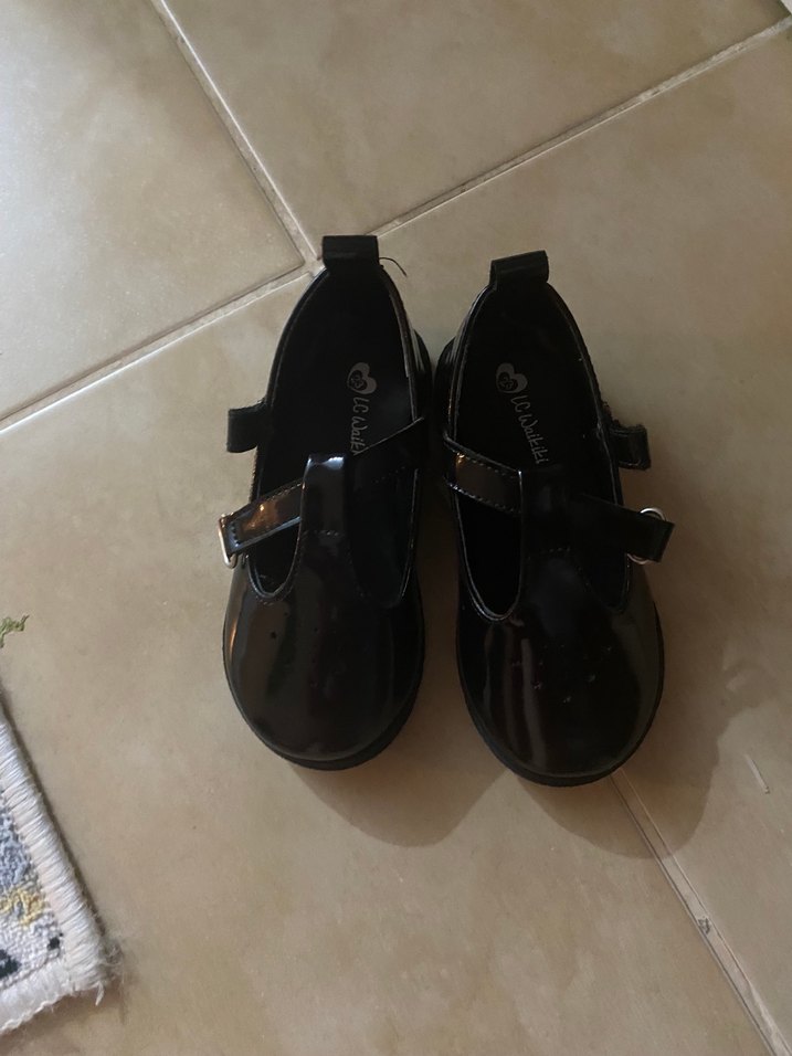 Siyah rugan malzemeden yapılmış, tokalı ve desensiz kız çocuk babet ayakkabıları, gotik tarz için uygun.