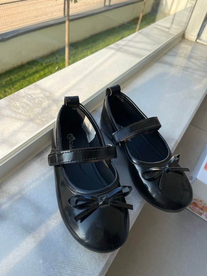 Kız çocukları için siyah rugan görünümlü, tokalı kayış ve fiyonk detaylı lastik babet ayakkabı.