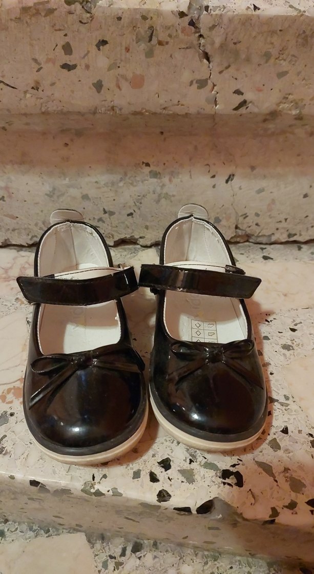 Kız çocukları için siyah rugan görünümlü, tokalı ve sade tasarıma sahip babet ayakkabı.