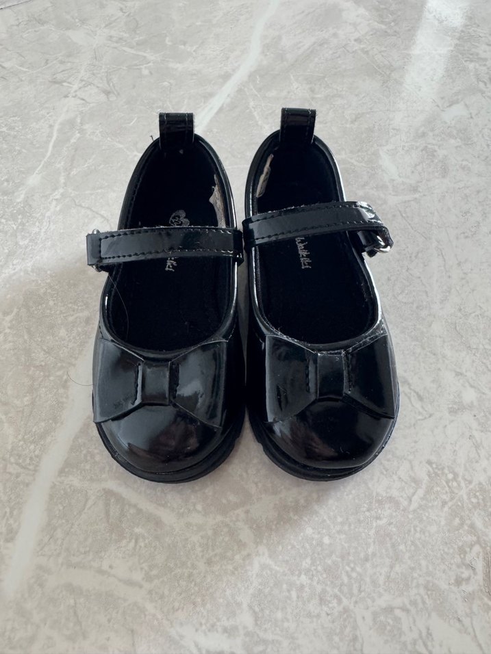 Kız çocukları için siyah rugan babet ayakkabı, tokalı kayış ve parlak yüzeye sahiptir. Dayanıklı kauçuk malzemeden yapılmıştır. Sadece bir kere giyilmiştir
