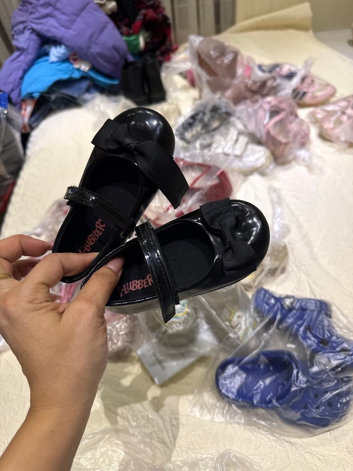Kız çocukları için siyah rugan görünümlü kauçuk babet, Velcro bantlı ve fiyonk detaylı, gotik esintili batik desenli. İçinde "UBBE" yazısı var.