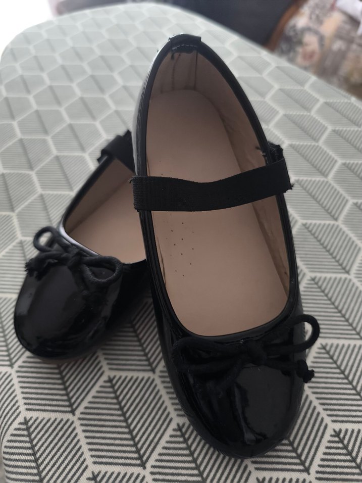 Kız çocukları için siyah rugan balerin ayakkabı, tokalı ve parlak yüzeyli, rahat kauçuk tabanlı. Trendsetter ve avangart tarz için uygun.