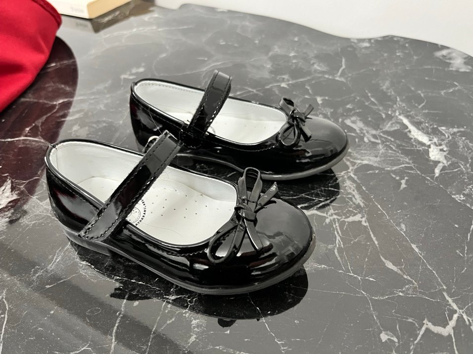 Kız çocukları için siyah rugan görünümlü, fiyonk detaylı ve klasik bantlı babetler. Parlak yüzeyi şıklık katıyor.