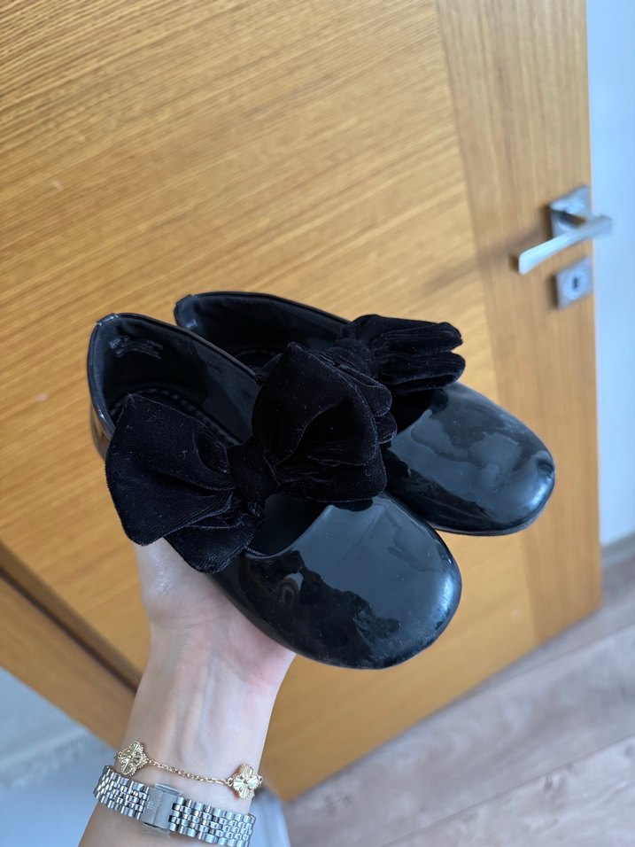 Kız çocukları için siyah rugan görünümlü, büyük fiyonk detaylı goth tarzda babetler. Parlak yüzeye ve sade tasarıma sahiptir. Resimde görüldüğü gibidir