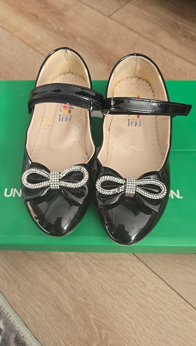 Siyah rugan görünümlü kız çocuk babeti, taşlı fiyonk ve bantlı tasarıma sahip. Üzerinde hafif yılan deseni bulunur. Kauçuk malzemedendir.