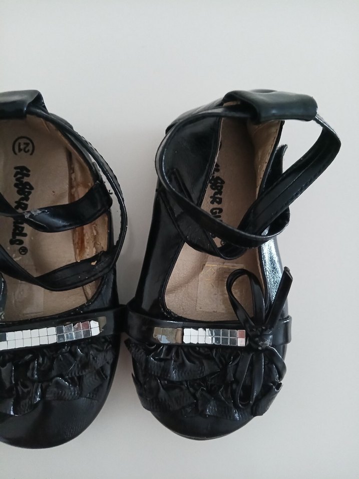 Kız çocukları için siyah rugan babetler, tokalı kayış ve küçük kare detaylı zarif fiyonk ile gotik ve avangart tarzda.