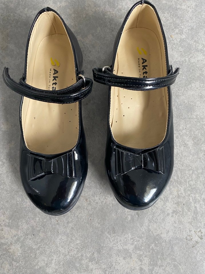 Kız çocukları için siyah rugan görünümlü, tokalı bant ve küçük fiyonk detaylı babetler, gotik tarz için uygun. ✨