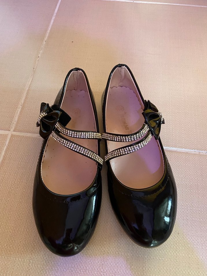 Kız çocukları için siyah rugan görünümlü, tokalı bantlara ve fiyonk detaylarına sahip babet ayakkabı. Klasik, parlak yüzeyli
