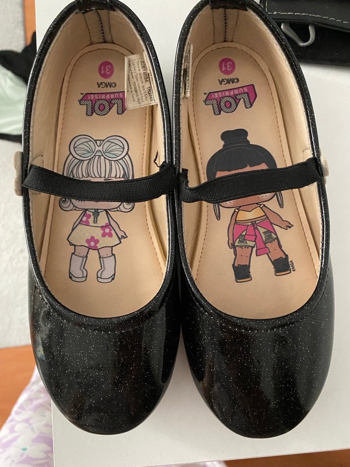 Siyah rugan kız çocuk babet, tokalı bant ve karakter baskılı iç taban ile. Numara 31. Trendy, gotik stil için uygun. Küçüldüğü için satıyorum sıfır gibidir alana hayırlı olsun