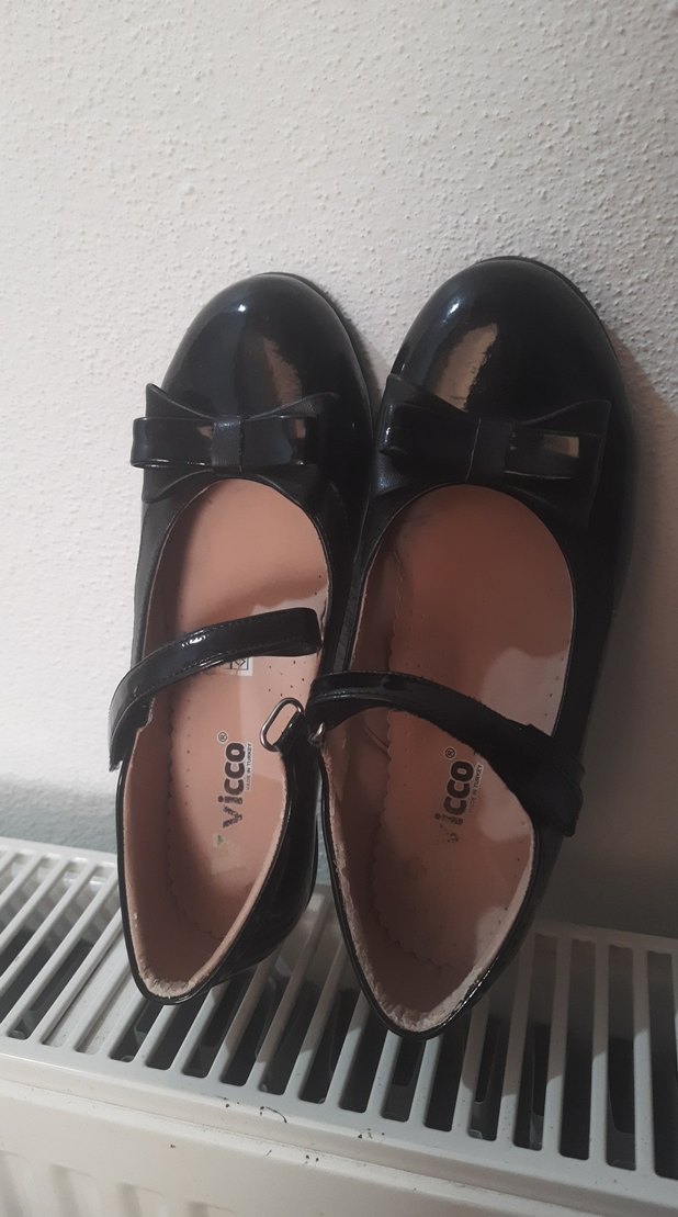 Kız çocukları için siyah rugan görünümlü, tokalı kayışlı ve desensiz tasarıma sahip babetler. Trendy ve avangart stil için uygundur.