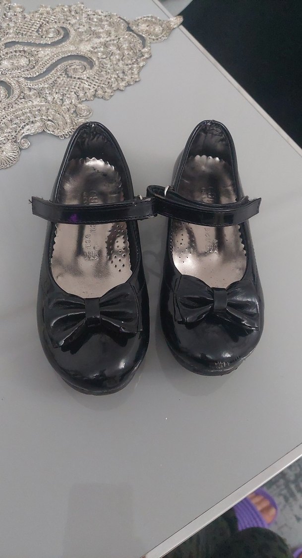 Siyah rugan görünümlü, tokalı bant ve fiyonk detaylı kız çocuk babeti, klasik goth tarzında, parlak kauçuk malzemeden yapılmıştır. ufak ucunda cızık var 2 kere gıyıldı baska bı sorunu yok
