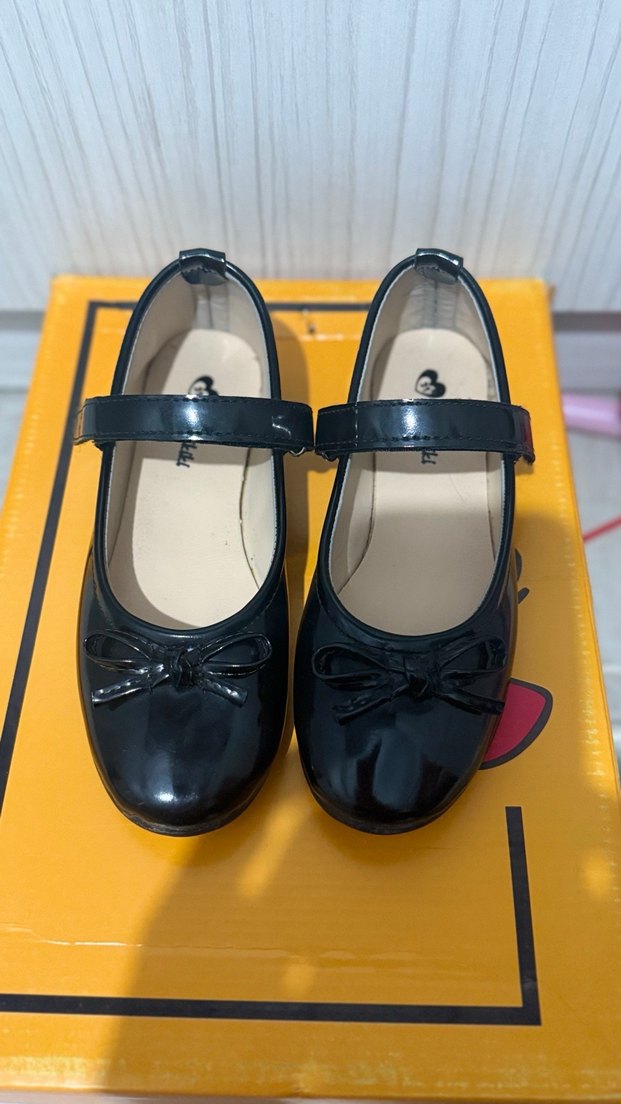 Kız çocukları için tokalı kayış ve küçük fiyonk detaylı siyah rugan babetler, klasik ve şık goth tarzını yansıtır.