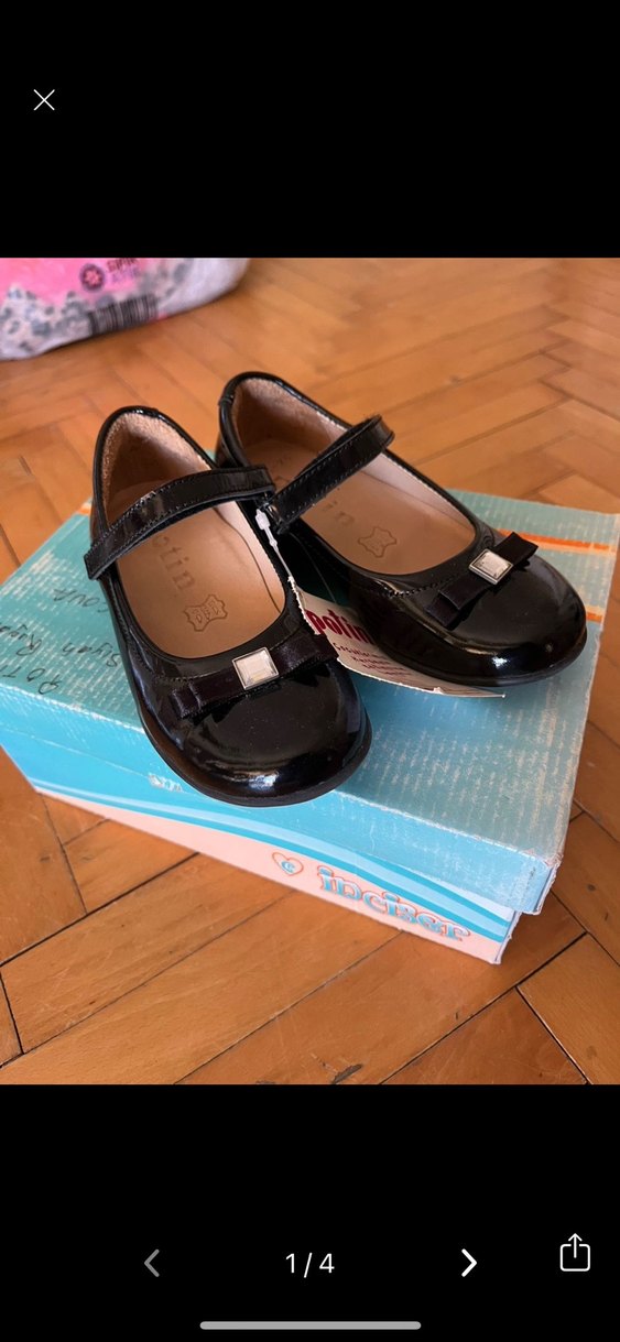 Kız çocukları için siyah rugan görünümlü, tokalı bantlı ve hafif desenli gotik tarzda babet ayakkabılar. Hiç kullanılmadı etiketi üstündedir