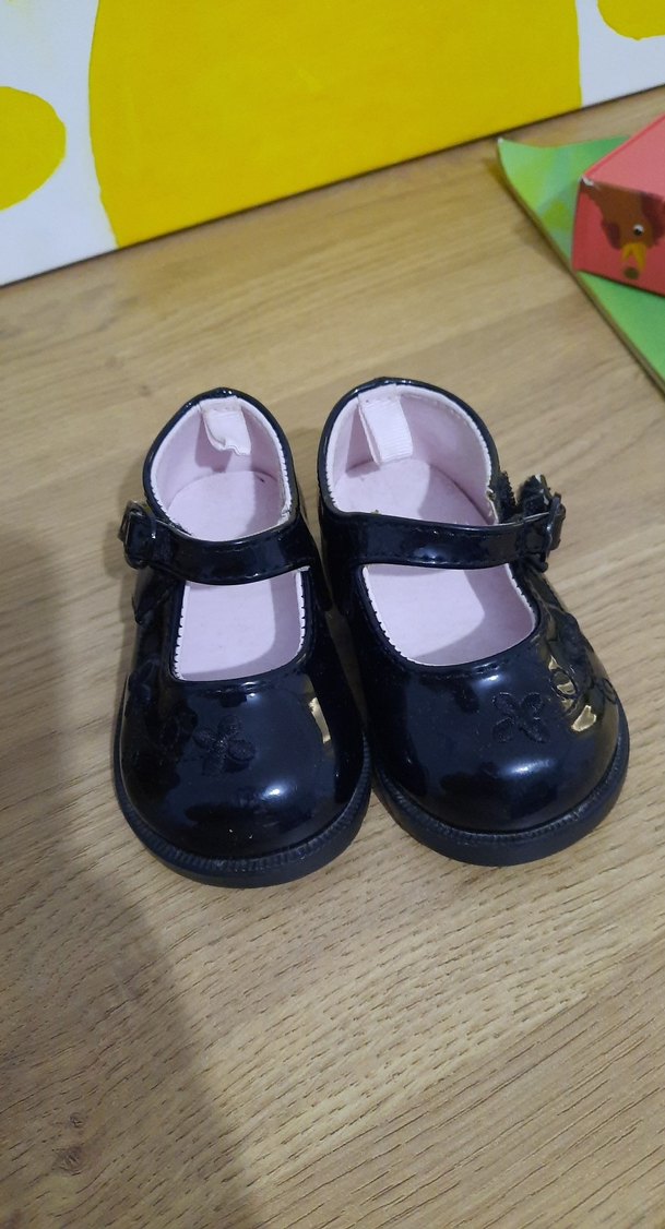 Kız çocukları için siyah rugan tokalı babet ayakkabılar, burunda hafif çiçek desenleriyle ve klasik goth tarzıyla kauçuk malzemeden üretilmiştir.