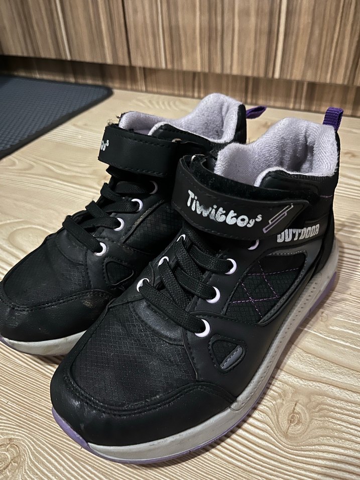 Siyah kız çocuk spor bot ayakkabısı, velcro bantlı ve kauçuk tabanlıdır. Trendy ve rahat sokak stili için uygundur. 'Tiwittoss' yazılıdır.