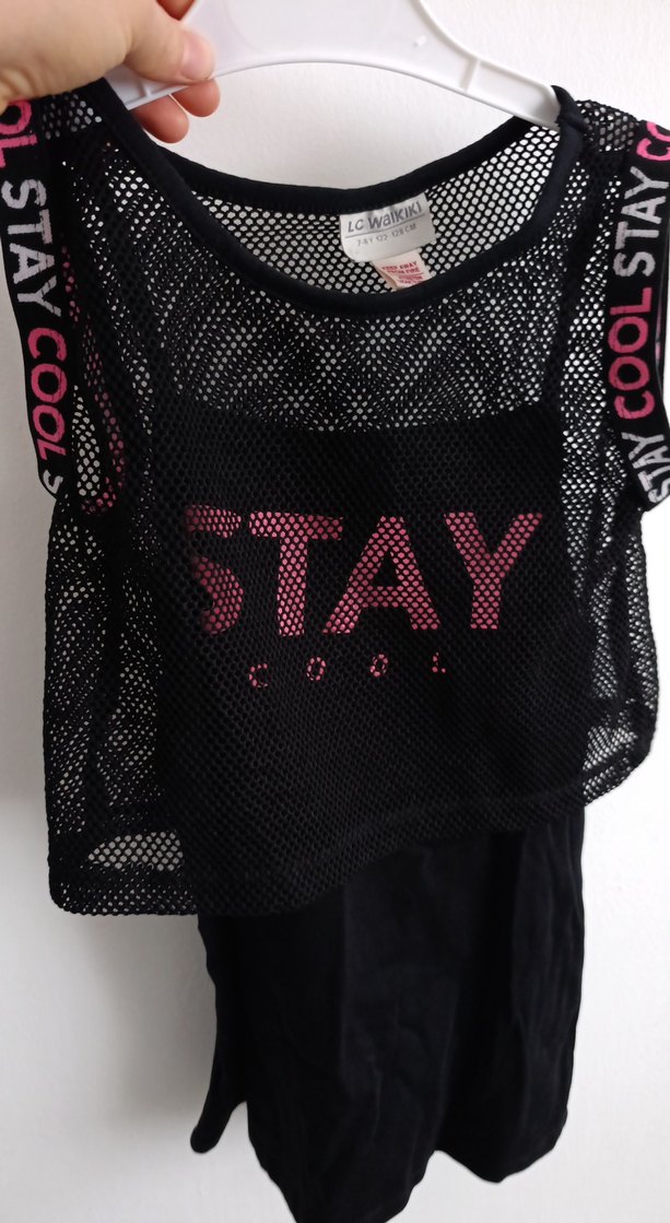 Bu siyah kız çocuk atleti, straplez yaka ve dantelli askılı kollara sahiptir. Vücuda oturan kesimi ve 'STAY COOL' baskısı ile rock punk tarzında sokak giyimi havası verir.