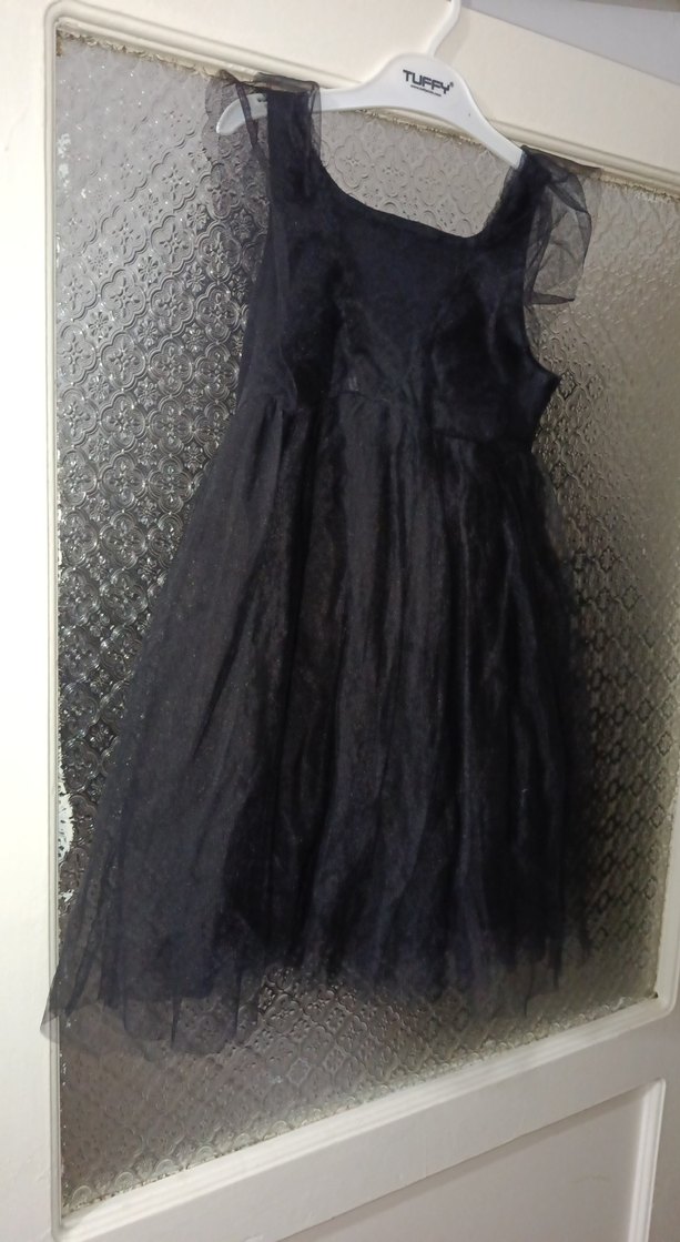 Kız çocukları için siyah, straplez, fırfırlı ve salaş kesim gotik elbise. Sentetik kumaştan, desensiz ve koyu renkte.
