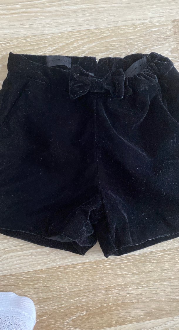 Kız çocukları için siyah süet şort, bol kesim ve belde dekoratif fiyonk bulunur. Düz, gotik tarzda yumuşak dokulu.