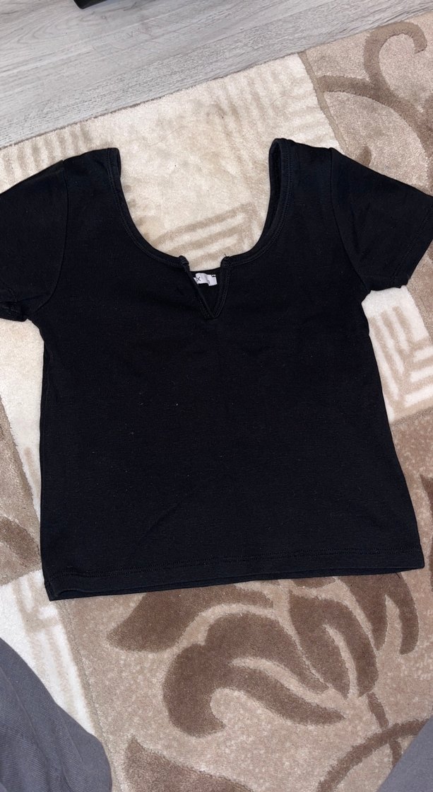 Siyah süet kumaştan, V yaka ve kısa kollu, kız çocukları için sade ve şık bir sokak stili tişört.