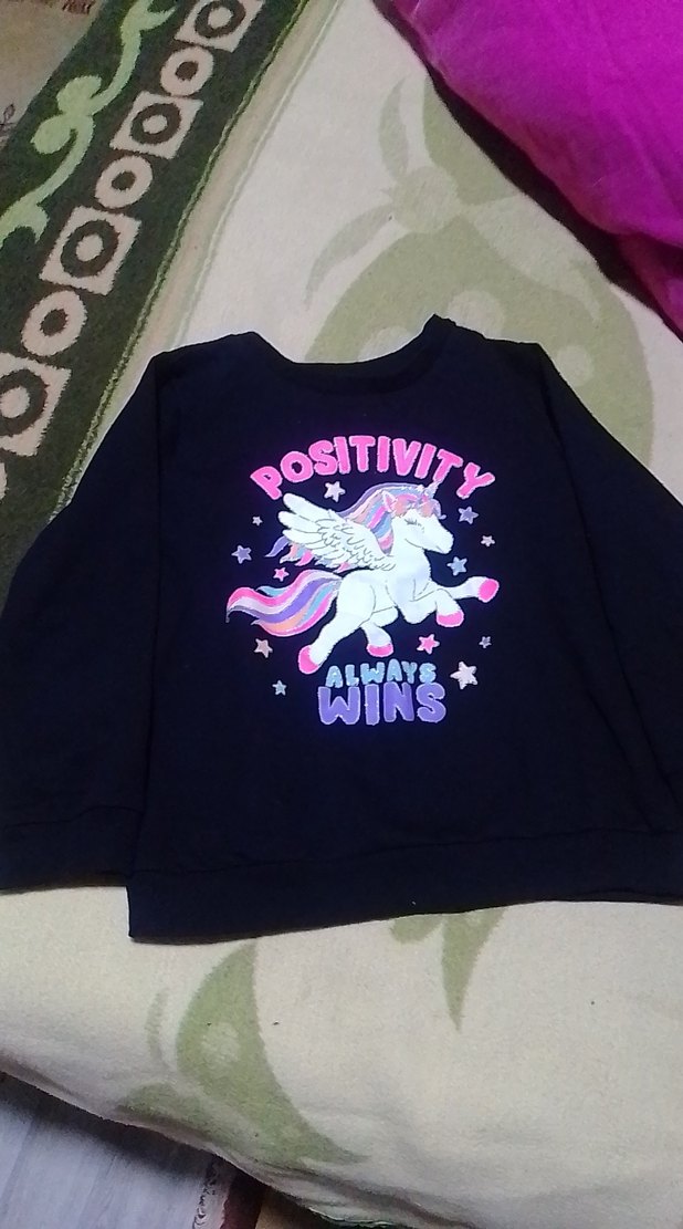 Uzun kollu, yuvarlak yakalı siyah kız çocuk sweatshirtü, renkli unicorn baskılıdır. Rahat ve bol kesimdir, yumuşak ve sıcak kumaştan yapılmıştır. hepsinin fiyatı 8 parça ürün