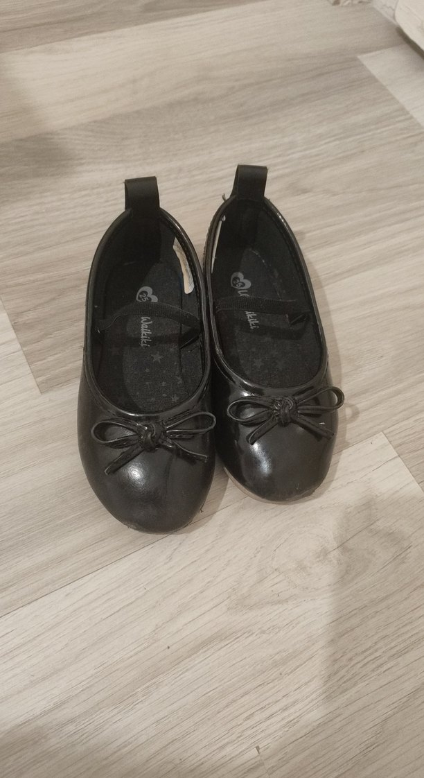 Siyah kız çocuk babetleri, kauçuk malzemeden ve tokalı kayış ile basit bir fiyonk detayıyla. Koyu renkli, desensiz ve gotik tarzda.
