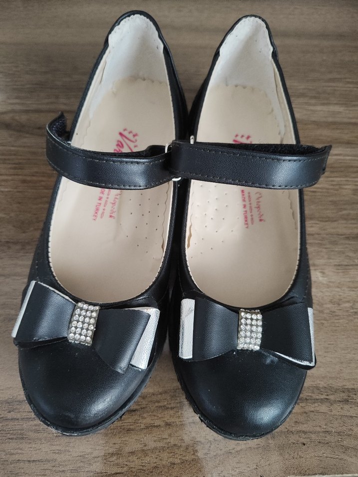 Siyah renkte, tokalı bantlı ve taşlı fiyonk detaylı kız çocuk babet ayakkabısı. Kauçuk materyalden üretilmiş, desensiz yüzeye sahip.