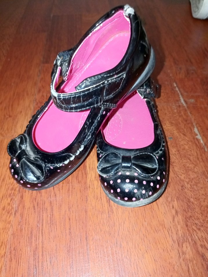 Kız çocukları için tokalı babetler, yumuşak kauçuk tabanlıdır. İç kısmı pembe, gothic tarzda ve uç kısmında fiyonk detayı vardır.