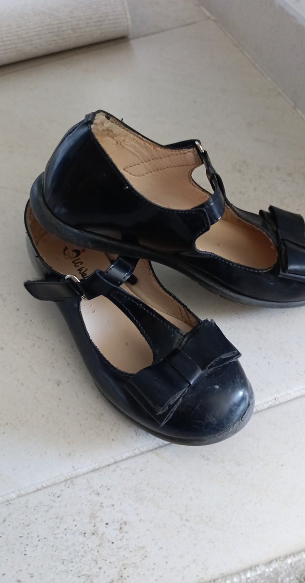 Siyah kauçuk kız çocuk babet ayakkabı, tokalı kayış ve desensiz sade tasarıma sahip tarzında.