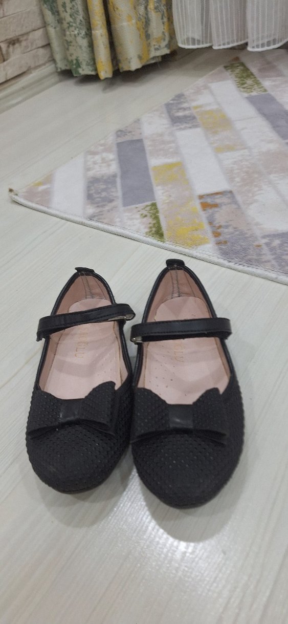 Siyah, tokalı kayışlı ve fiyonk detaylı kız çocuk babet ayakkabı, koyu ve desensiz tasarıma sahip, kauçuk malzemeden yapılmıştır. bir kac kere giyilmistir yeni gibidir temizdir