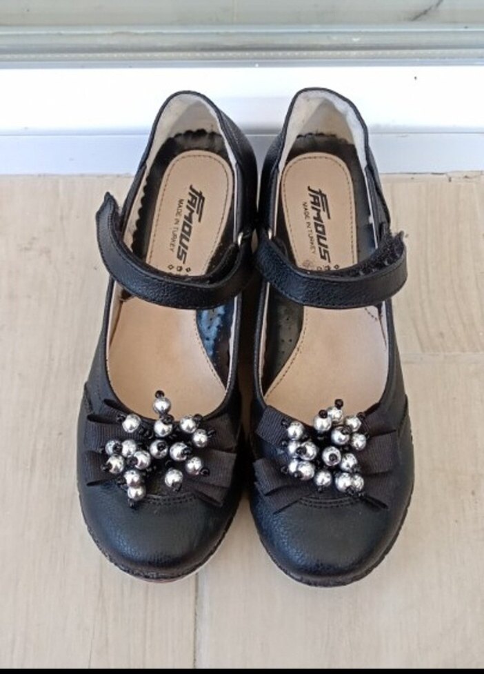 Siyah renkli, tokalı kız çocuk babet ayakkabısı. Gotik tarzda, boncuk detaylarıyla süslenmiş, kauçuk malzemeden üretilmiştir.ayakkabı sayılı giyildi yıllardır dolapta duruyor sağ arka kısmında hafif bir açılma var bu yüzden fiyatı uygun tuttum küçük bir yapıştırıcı ile hallolur