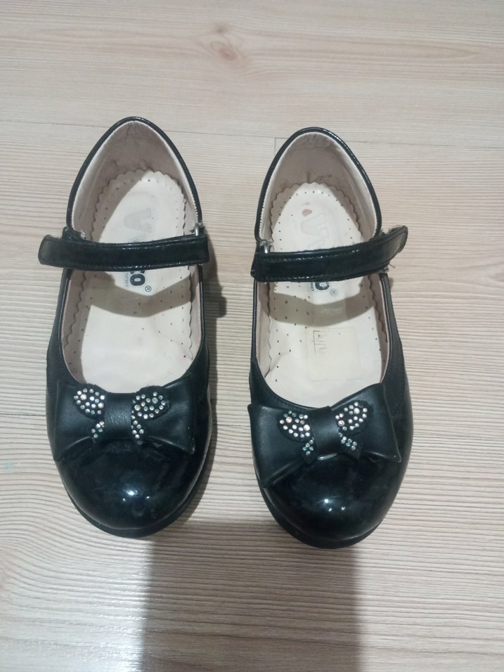 Siyah kız çocuk babetleri, tokalı kayış ve fiyonklu detaylı, kauçuk malzemeden. Düz ve desensiz, klasik gotik tarzda.