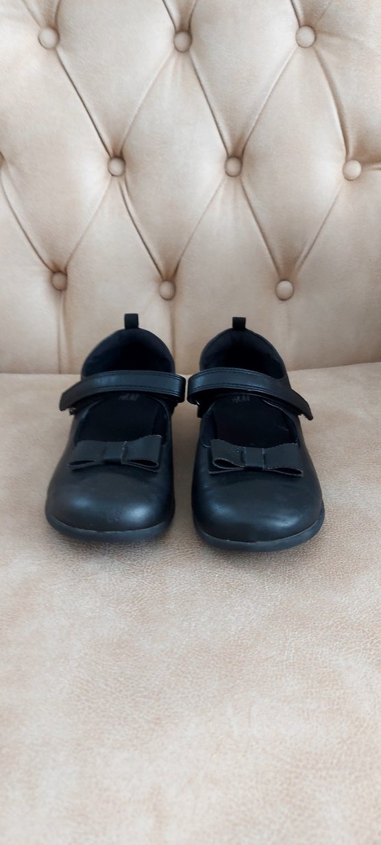 Kız çocuklar için siyah, tokalı ve küçük fiyonk detaylı, lastik malzemeden yapılmış babet ayakkabılar. Düz, gotik tarzda ve sade görünüme sahip. Sağ burunda defo var(son foto )