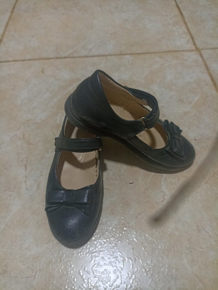 Kız çocukları için siyah renkli, tokalı bantlı ve küçük fiyonk detaylı kauçuk babet ayakkabılar. Desensiz sade tasarıma sahiptir.