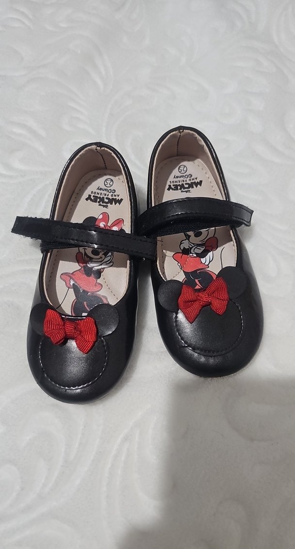 Tokalı siyah kız çocuk babet ayakkabı, Minnie Mouse baskılı ve kırmızı fiyonk detaylıdır. Rahat kullanım için kauçuk malzemeden üretilmiştir.