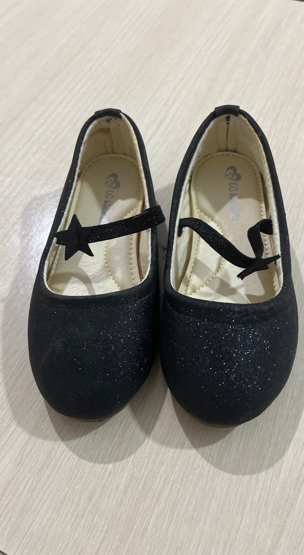 Kız çocukları için siyah tokalı bale ayakkabısı, yıldız detaylı ve kauçuk malzemeden. Düz ve desensiz, gotik stile uygun.
