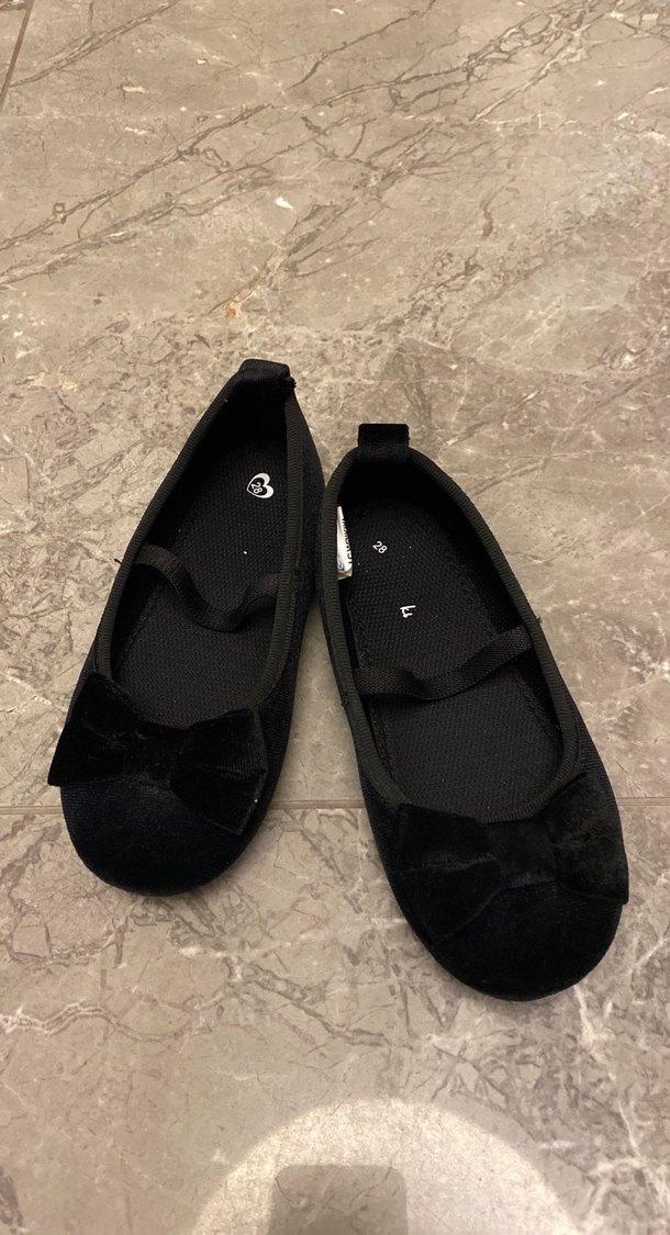 Tokalı, siyah kız çocuk bale ayakkabısı. Yumuşak kauçuk malzemeden, sade ve gotik tarzda, desensiz tasarım.