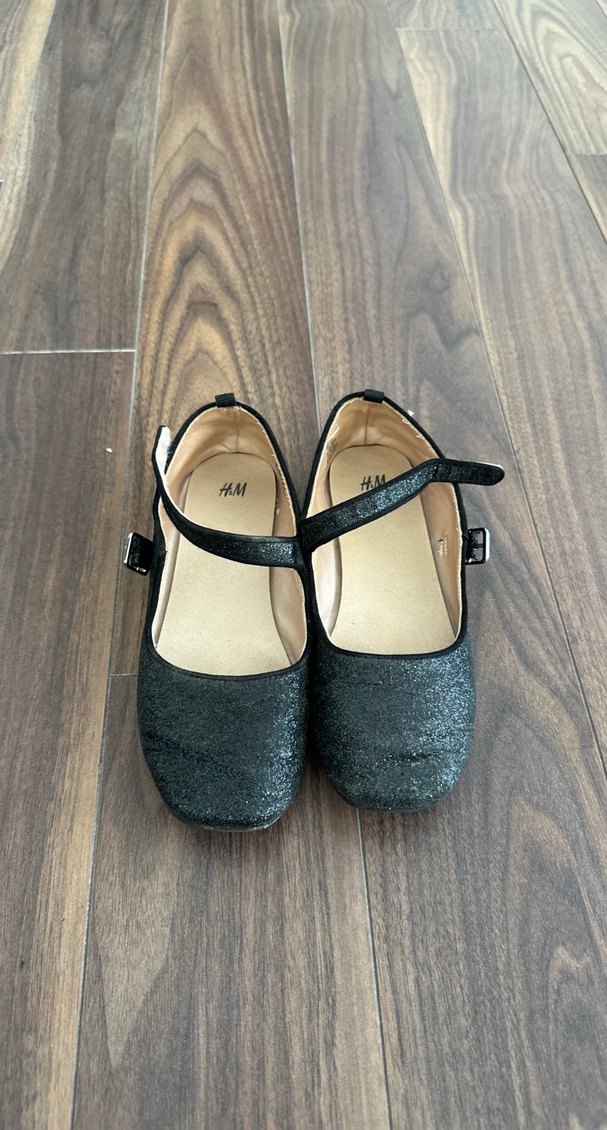 Kız çocukları için tokalı, kauçuk malzemeden siyah bale ayakkabısı. Desensiz ve goth tarzına uygun, H&M markası.