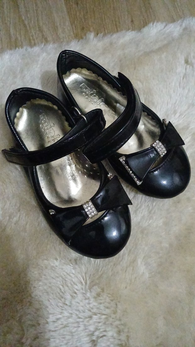 Kız çocukları için tokalı bantlı siyah kauçuk bale düz ayakkabı. Fiyonk ve taş detaylarıyla klasik gotik tarzda, desensiz yüzeye sahip.