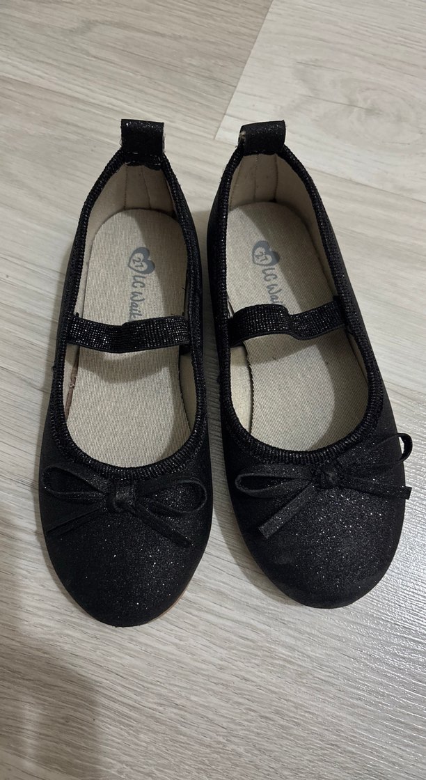 Kız çocukları için tokalı siyah bale düz ayakkabı, kauçuk malzemeden ve küçük fiyonk detaylı sade tasarım. Trendy rahat stil için uygundur.