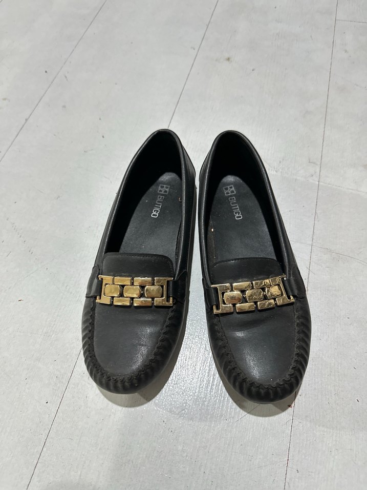 Kız çocukları için tokalı, siyah kauçuk loafer ayakkabılar. Desensiz ve trend sokak tarzına uygun.