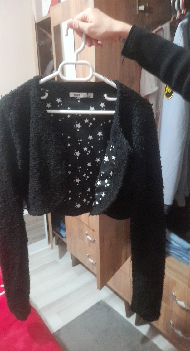 Kız çocukları için siyah, ince kesim, uzun kollu triko bolero. Yumuşak polar kumaştan üretilmiş, yıldız desenli iç astarı vardır. Trend goth tarzına uygundur.