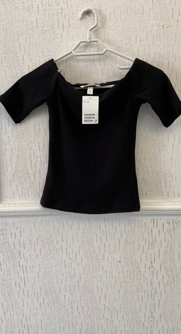 Kız çocukları için kısa kollu, kayık yaka ve triko kumaştan yapılmış siyah, vücuda oturan bluz.