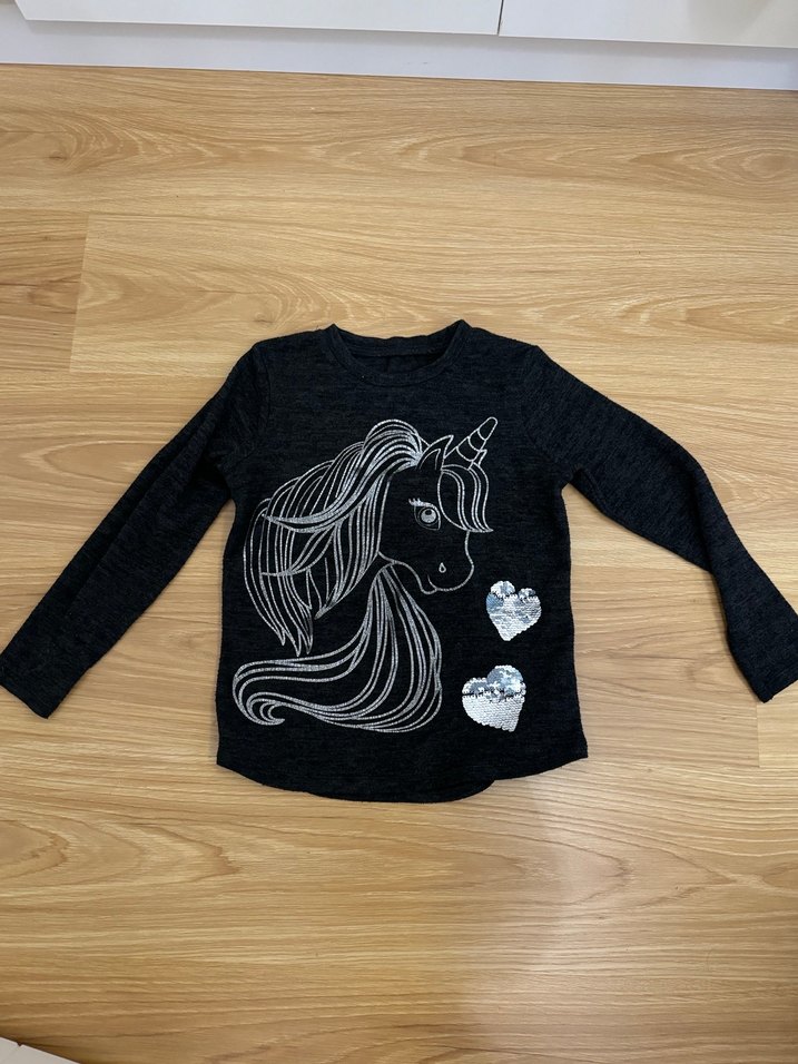 Kız çocuk siyah triko sweatshirt, uzun kollu ve yuvarlak yaka olup, bol kesimdir. Yumuşak ve sıcak kumaştan yapılmış, parlak kalp detaylı unicorn baskısı bulunur.