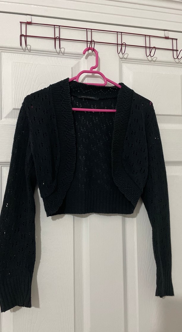 Uzun kollu, yuvarlak yakalı siyah triko bolero, vücuda oturan kesimiyle trend ve gotik tarz sunar.