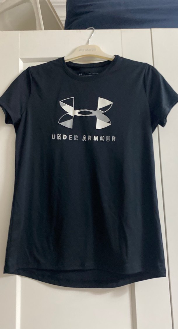 Kısa kollu, dar kesim kız tişörtü, önünde baskılı Under Armour logosu ile siyah renkte. Çocuk XL olarak geçiyor bedeni.