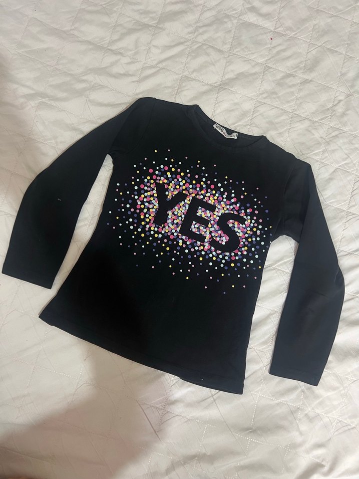 Siyah renkli, uzun kollu kız çocuk tişörtü, önünde renkli baskı ve payetlerle süslenmiş 'YES' yazısı bulunur. Yuvarlak yakalı ve yumuşak sentetik kumaştan üretilmiştir.