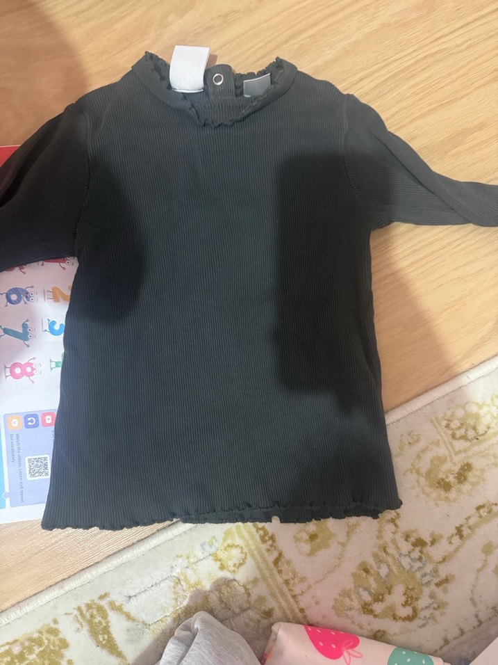 Kız çocuklar için siyah, uzun kollu, dar kesim bluz. Yakada hafif fırfır detayları ve yumuşak kumaş , sade ve şık. Sayılı kullanıldı