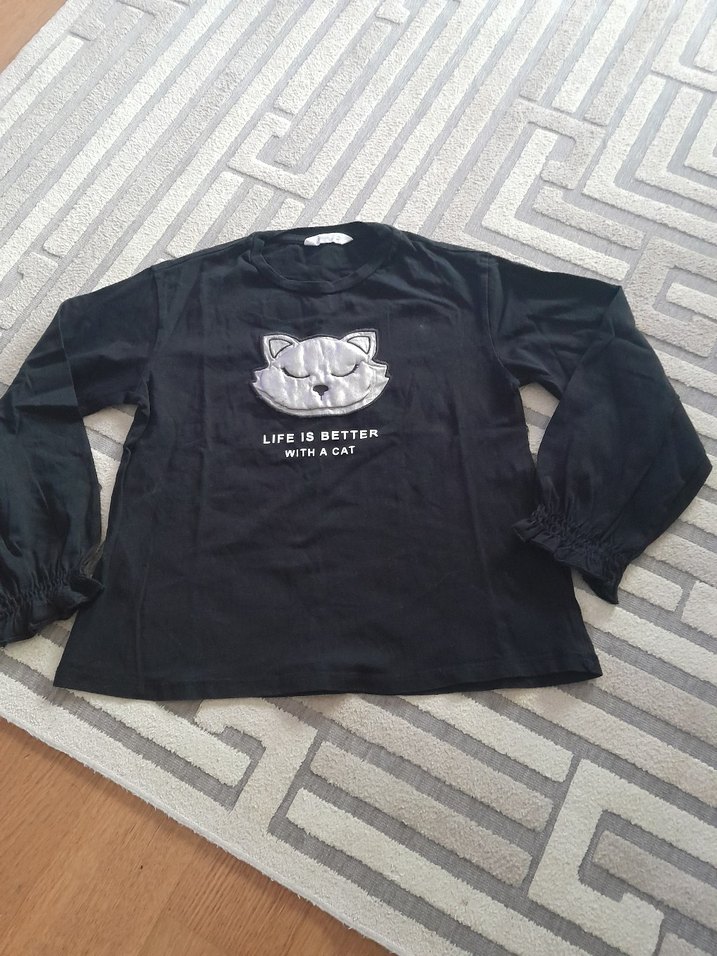 Kız çocukları için siyah pamuklu, uzun kollu, yuvarlak yakalı, bol kesim tişört. Üzerinde baskılı kedi deseni ve düğme detayları bulunur. Rahat ve günlük tarzda.